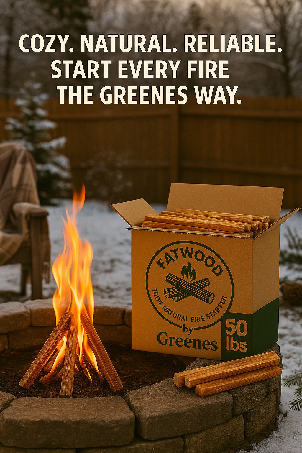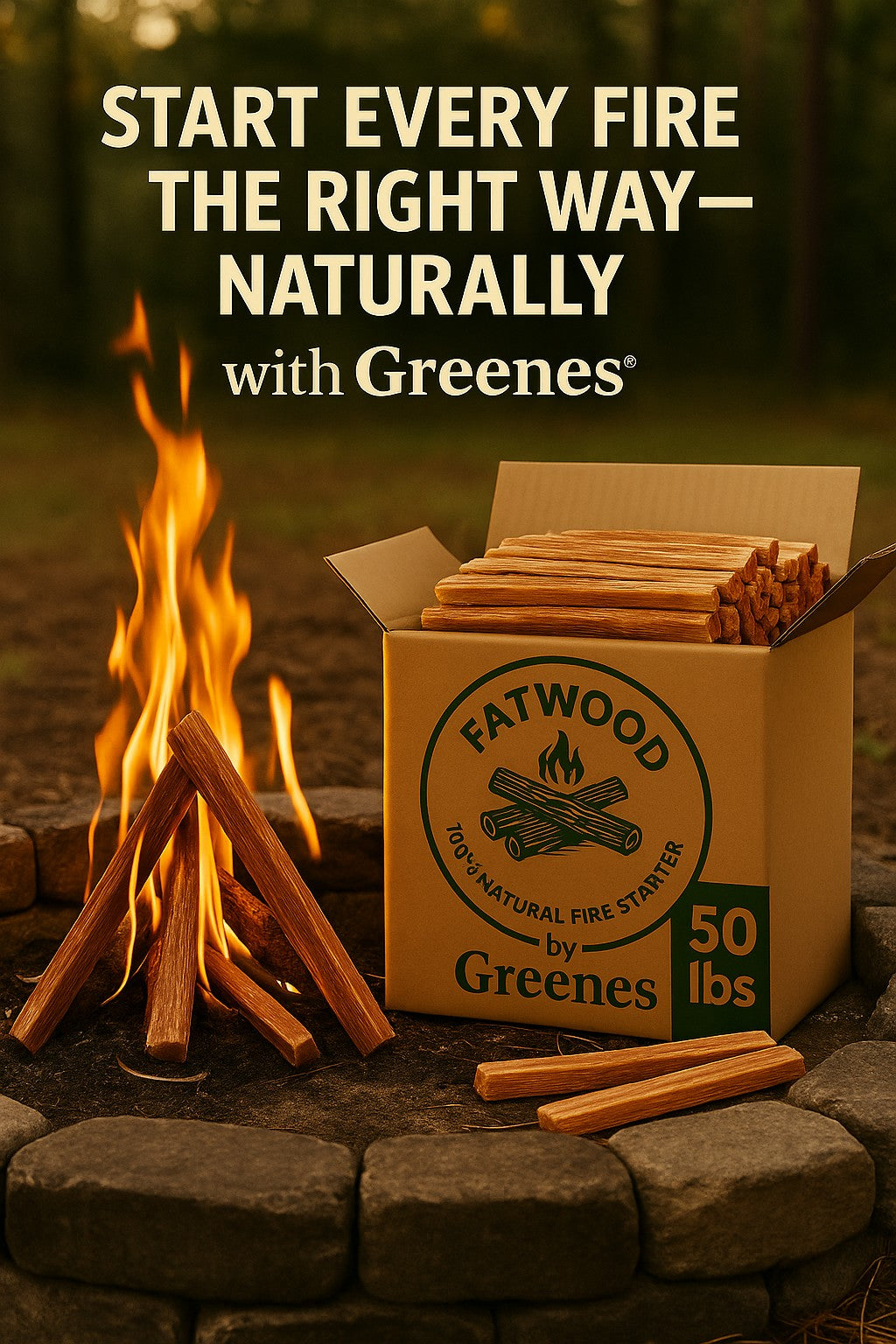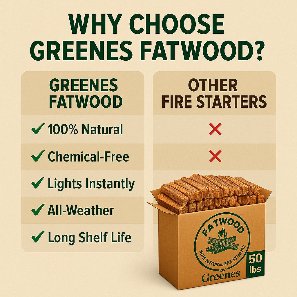 Ignite any fire fast — naturally. Fatwood by Greenes® is nature’s original fire starter, cut from pine stumps saturated with natural resin. It lights instantly, burns hot and long, and works in any weather — no chemicals, no mess, just pure pine power and the lowest cost per pound.
